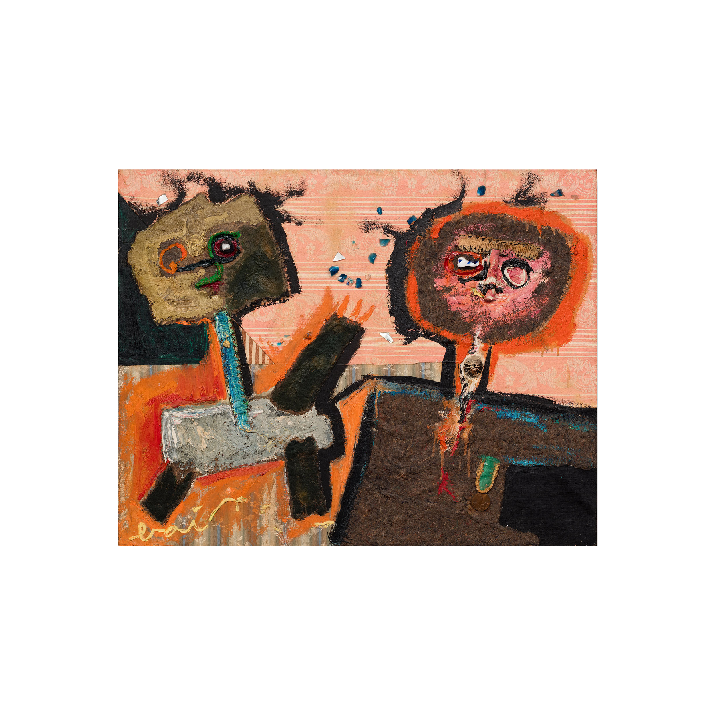Oil, collage, padding, glass, passementerie, decoration on fabric applied on canvas